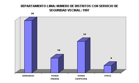 Según los resultados de la Encuesta Nacional de Municipalidades e Infraestructura Socio Económica Distrital 1997, en el departamento de Lima existen 35 distritos que reportan tener servicios de Serenazgo, 10 Distritos con Ronda Urbana y 21 Distritos con Ronda Campesina.