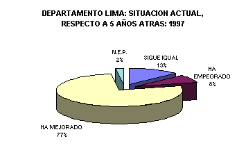 Según los Resultados de la Encuesta Nacional de Municipalidades e Infraestructura Socio Económica Distrital 1997, en el departamento de Lima el 77% del total de los distritos, informó que su situación ha mejorado, el 13% sigue igual y el 8% ha empeorado. Asimismo, observamos que en Lima Metropolitana el 90% de los distritos informaron que la situación actual ha mejorado respecto a 5 años atrás. Así mismo en el resto de provincias del departamento de Lima el 72% informaron que su situación actual ha mejorado respecto a 5 años atrás.
