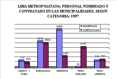 FUENTE: INEI - Encuesta Nacional de Municipalidades e Infraestructura Socio Económica Distrital 1997 De las 7,120 personas contratadas en las Municipalidades 5,257 son hombres ( 73.8%) y 1,863 mujeres (26.2%). Además 483 son Directivos, 2,568 son Empleados, 1167 son Obreros, 2,109 Personal de Vigilancia y 793 de Limpieza.