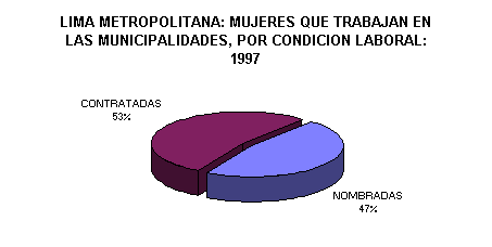 En las Municipalidades de Lima Metropolitana, a mayo de 1997, trabajaban 3,515 mujeres de las cuales 1,652 son nombradas que representan el 47 % y 1,863 son contratadas representando el 53 %.