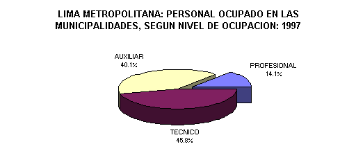 FUENTE: INEI-Encuesta Nacional de Municipalidades e Infraestructura Socio Económica Distrital 1997 Del total de mujeres ocupadas en las Municipalidades de Lima Metropolitana, según la categoría de ocupación se tiene que el 9% son Directivos, el 65% Empleadas, el 13% Obreras, el 12% Personal de Limpieza y sólo el 1% Vigilantes. 2.3.1.2 Personal de las Municipalidades por Nivel de Ocupación Según la Encuesta de Munici-palidades a mayo de 1997, la calificación del personal que trabaja en las 49 Municipalidades de Lima Metropolitana, es la siguiente: 14.1% son Profesionales, 45.8% Técnicos y 40.1% Auxiliares.