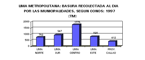 En el año 1994, las 49 Munici-palidades de Lima Metropolitana, recogían diariamente 3,833.8 Toneladas Métricas generadas por 6 millones 434,323 habitantes. De acuerdo a los resultados de la Encuesta de 1997, la población genera diariamente 4,717 Toneladas Métricas. Observándose un incremento del 23% en el recojo de la basura.