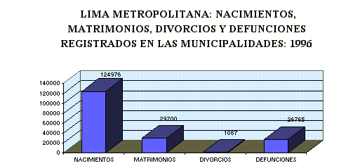 La Municipalidad tiene entre sus funciones la organización de los registros civiles y la inscripción de los hechos vitales. Los Registros del Estado Civil, resguarda los derechos de la familia, la mujer y el menor. Con la inscripción de los nacimientos, matrimonios y defunciones se protege los derechos al nombre, identidad, nacionalidad y filiación, entre otros. La información estadística de nacimientos, matrimonios, divorcios y defunciones permiten evaluar el comportamiento de los principales hechos vitales, contribuyendo de esta manera al conocimiento de la dinámica poblacional. En 1996, las 49 Municipalidades de Lima Metropolitana han registrado 124,976 nacimientos, 29,700 matrimonios, 1,087 divorcios y 26,765 defunciones, observándose un mayor número de nacimientos en los distritos de Lima 26,578, Jesús María 12,388, San Juan de Miraflores 7,543 y Miraflores 6,484 nacimientos, este hecho se debe a que existen hospitales y maternidades que atienden partos de madres residentes en diversos distritos de Lima y Callao. En el período Enero-Mayo 1997 se registraron 57085 nacimientos, 11,352 matrimonios, 11,432 defunciones y 593 divorcios. Con respecto a matrimonios en 1996, la Municipalidad de San Juan de Lurigancho ha celebrado 1,607 matrimonios, seguido por las Municipalidades de Comas con 1,515, San Martín de Porres 1,413, Surco 1,380, Lima 1,303, San Juan de Miraflores 1,237, Jesús María 1,093, Villa María del Triunfo 1,091, San Borja 1,016 y Chorrillos con 1,088 matrimonios. El resto de Municipalidades han realizado menos de mil matrimonios. En cuanto a divorcios en 1996, los distritos de Miraflores y San Isidro presentan el mayor número de disoluciones, registrando 141 y 125 respectivamente. En relación a defunciones en 1996, se observa que las municipalidades con mayor número de casos registrados son: Lima con 3,246, La Victoria con 3,036 y Jesús María con 2,879.