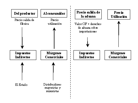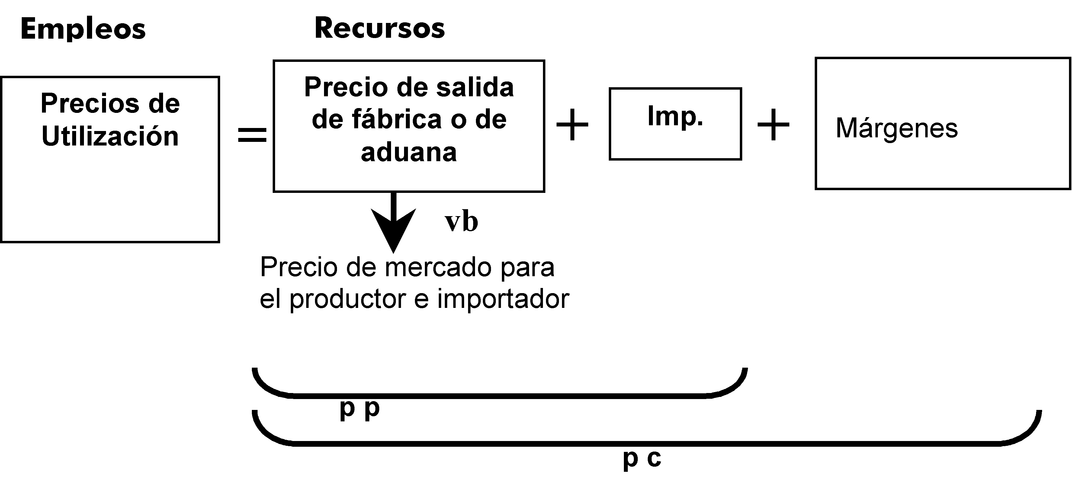 El precio productor es igual al valor básico más los impuesto indirectos pp = vb + impuestos indirectos El precio de comprador es igual al precio productor más los márgenes comerciales pc = pp + márgenes comerciales