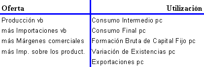 Equilibrio recursos – empleos en valor Para poder consolidar los equilibrios empleos recursos de todos los productos de la economía, es necesario valorar los elementos del equilibrio en una unidad común: la unidad monetaria y así se obtiene el equilibrio de cada producto en valor. En el nuevo sistema de cuentas nacionales cada elemento del equilibrio se valora al precio del mercado, es decir al cual los agentes económicos: productores, importadores, consumidores, venden o compran el producto correspondiente. El precio de mercado para los empleos, consumo intermedio, consumo final, formación bruta de capital fijo, variación de existencias y exportaciones, es el precio de adquisición o utilización, el cual incluye los impuestos indirectos netos y los márgenes comerciales. El precio de mercado para los recursos es el recio de salida de fábrica (que en cuentas nacionales se denomina valor básico) para la producción y el precio de salida de aduana para las importaciones, es decir el precio que recibe el productor y el que paga el importador. Expresando los elementos del equilibrio al precio de mercado, este equilibrio no puede realizarse, al valor de los recursos, no se le agregan los impuestos indirectos netos y los márgenes comerciales. ![]()