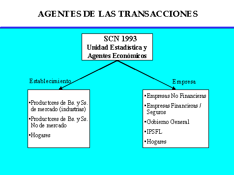 FORMAS DE PRESENTACIÓN Para ordenar cuantitativamente las características de la economía y desarrollar en forma coherente y objetiva las funciones de los agentes, el Sistema de Cuentas Nacionales adopta diferentes formas para presentar el proceso económico. Dicho esquema además de las cuentas "T" está constituido por ecuaciones, matrices y diagramas de flujo. Las matrices son cuadros de doble entrada, en los cuales cada cuenta se representa mediante una fila y una columna. En las filas constan las entradas y en las columnas, las salidas. Esta representación matricial se puede verificar en las siguientes: Matrices de Operaciones No Financieras y Financieras, Tablas Insumo-Producto, Matrices de Producción, Cuadro Económico de Conjunto; que permiten observar con mayor detalle los principales aspectos de la economía. Otras formas de presentación del Sistema de Cuentas Nacionales, son los diagramas de flujo (flechas) en éstos se muestran las cuentas (recuadros) y los flujos (flechas) con clara indicación de la naturaleza y del valor de las operaciones. ESTRUCTURA DEL SISTEMA DE CUENTAS NACIONALES La elaboración de las Cuentas Nacionales requiere de la agrupación de gran variedad de operaciones y unidades económicas elementales en ciertas categorías fundamentales, que se presentan en un esquema de cuentas y cuadros comprensibles coherentes e integrados. Este conjunto de cuentas y cuadros armonizados, es el que posibilita el análisis del funcionamiento del sistema económico; y la clasificación de agentes y transacciones permite dar una definición operativa a las variables que sugiere la teoría económica. Las cuentas son estados equilibrados. Para el registro de las transacciones se sigue el principio de la partida doble, que supone: Toda operación se registra dos veces, una como ingreso en la cuenta del perceptor y otra como empleo o salida en la cuenta del pagador. En esta parte se presenta una descripción de la estructura global del SNC. La presentación va de lo más simple a lo más complejo. LOS AGENTES DE LAS TRANSACCIONES Como en cualquier sistema de contabilidad nacional, se requiere agrupar a los agentes de las transacciones pues sería imposible e inútil tratarlos por separado. No obstante, técnicamente no es necesario que dicho agrupamiento sea efectuado de l a misma manera en todas las partes del sistema y, en la práctica, tampoco es conveniente hacerlo. El SCN consideran dos principales clases de agentes, una relacionada con las corrientes de bienes y servicios y aplicable a las cuentas de producción, gastos de consumo y formación de capital; y otra, relacionada con las corrientes financieras y aplicable a las cuentas de los ingresos y de acumulación.