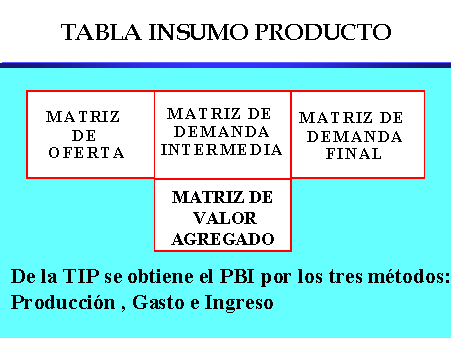 2. Estructura de la Tabla Insumo-Producto Las Tablas Insumo-Producto permite apreciar los componentes de la Matriz de Oferta, Matriz de Demanda Intermedia, Matriz de Demanda Final y la Matriz del Valor Agregado, configurándose de esta manera una tabla de cuatro matrices, que permite obtener en forma directa el Producto Bruto Interno (PBI) por el método de Producción , Tipo de Gasto y Tipo de Ingreso. ![]()
