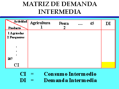 2.2 Matriz de Demanda Intermedia En esta matriz se registran los flujos de circulación interindustrial de productos entre las diferentes actividades, muestra la utilización intermedia de los bienes y servicios en el sistema económico, es decir el uso de los productos en la elaboración o producción de otros. El casillero final de cada fila, muestra la demanda intermedia total del producto correspondiente, mientras en el casillero final de cada columna, se refleja el consumo intermedio de la respectiva actividad económica. La relación entre los elementos de esta matriz con la producción de la actividad económica correspondiente define la matriz de coeficiente técnicos. ![]()
