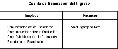CUENTA DE GENERACION DEL INGRESO Registra desde el punto de vista de los productores, las operaciones de distribución ligadas directamente al proceso productivo; el recurso lo constituye el valor agregado. Las operaciones de distribución que se registran en los usos se refieren a la remuneración de asalariados, los impuestos sobre la producción e importaciones y la partida saldo en esta cuenta es el excedente de explotación.