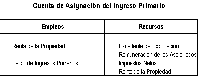 CUENTA DE ASIGNACION DEL INGRESO PRIMARIO Muestra como se distribuyen las rentas primarias entre las unidades y sectores institucionales; son rentas percibidas a consecuencia de la intervención en procesos de producción o de la propiedad de activos, registra, para cada sector la renta de propiedad cobrados y pagados, la remuneración de asalariados e impuestos y subsidios; registran como recursos al excedente de explotación y como partida saldo los ingresos primarios.