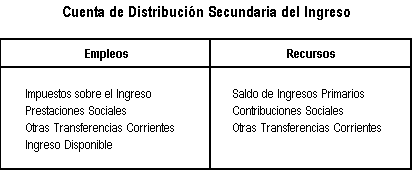 CUENTA DE DISTRIBUCION SECUNDARIA DEL INGRESO Muestra como se transforma el saldo de ingresos primarios de una unidad o sector institucional en su ingreso disponible mediante el ingreso y pago de transferencias corrientes, excluyendo las transferencias sociales en especie. Esta distribución constituye la segunda fase del proceso de distribución del ingreso tal como se muestra en las cuentas del sistema. Esta cuenta registra como recursos, además del balance de los ingresos primarios, los impuestos corrientes sobre los ingresos, riquezas y otras transacciones sociales en especie, por el lado de usos o empleos se registran los mismos tipos de transacciones; pero como gastos o salidas de la unidad o sector institucional; ya que estas transferencias son recursos para algunos sectores y usos para otros, su contenido exacto varia de un sector a otro. La partida saldo es la renta disponible o ingreso disponible.