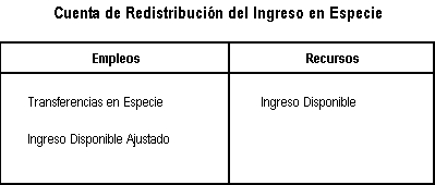 CUENTA DE REDISTRIBUCION DEL INGRESO EN ESPECIE Esta cuenta presenta dos elementos del proceso de redistribución : - En primer lugar registra las prestaciones sociales en especie, que son aquellas que no dan lugar a gastos por parte del hogar beneficiario como las prestaciones por las que el hogar hace el pago inicialmente y que posteriormente se le reembolsa. - En segundo lugar, registra la transferencia de bienes y servicios no mercantes. Esta cuenta, registra, como recursos el ingreso disponible y para los hogares las transferencias sociales en especie, por el lado de usos o empleos, las transferencias sociales en especie que figuran en el gobierno general y las instituciones privadas sin fines de lucro al servicio de los hogares. La partida saldo es el ingreso disponible ajustado; por la naturaleza de las transacciones esta cuenta se elabora para el gobierno general, los hogares y las IPSFL al servicio de los hogares.