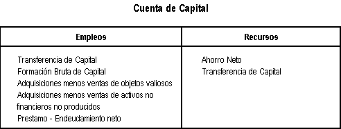 CUENTA DE CAPITAL Esta cuenta muestra el registro de las transferencias ligadas a adquisiciones de activos no financieros y transferencias de capital que implican redistribución de riqueza; en recursos se incluyen al ahorro neto y las transacciones de capital netas (las cobradas menos las pagadas) a fin de llegar a la parte de las variaciones del patrimonio Neto debidas al ahorro y las transferencias de capital; en usos o empleos aparece la formación bruta de capital fijo; que están ligadas a las adquisiciones de activos tangibles e intangibles; con signo negativo se registra el consumo de capital fijo para llegar a la formación neta de capital fijo y la variación de existencias. La partida saldo es el préstamo neto; que mide la capacidad, de una unidad o sector institucional; que tiene a su disposición para financiar directa o indirectamente a otras unidades o sectores institucionales.
