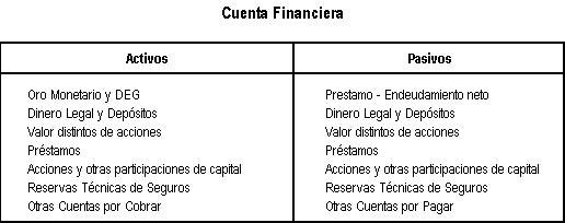 CUENTA FINANCIERA Esta cuenta registra transacciones de instrumentos financieros para cada uno de las unidades o sectores institucionales. Estas transacciones muestran en el sistema la adquisición neta de activos financieros por el lado de los usos y las deudas netas por el lado de los recursos; la partida saldo es, el préstamo neto que es la partida que equilibra los usos y los recursos.