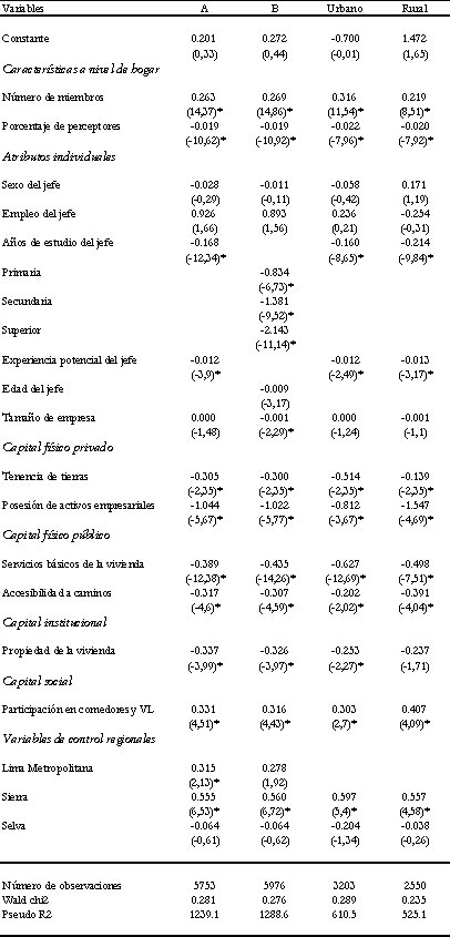 Fuente: ENAHO 98-IV. Estadísticos "t" entre parentesis (*) Significativo al 95 %.