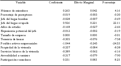 En cuanto al las variables de capital humano, situación ocupacional del jefe de hogar y características demográficas del hogar, se observa que la variable más importante es el tamaño de la familia, en términos de tener impacto en incrementar la probabilidad de ser pobre. Así, un cambio marginal en esta variable aumenta la probabilidad de ser pobre en 4 por ciento aproximadamente.