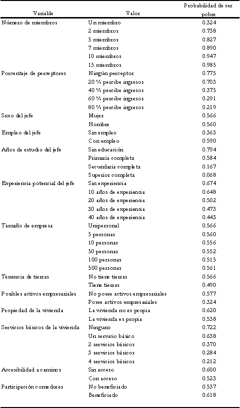 Una variable que no podemos dejar de resaltar como palanca para superar la pobreza es la presencia del capital físico privado (activos microempresariales de los hogares). Pasar de no tener activos a tener activos reduce la probabilidad de ser pobre de 57 % a 32 %. Por otro lado, tener capital físico público (accesibilidad a caminos) con respecto a no tener acceso reduce la probabilidad de ser pobre en 60 % a 52 %. Otra variable que llama la atención es el número de personas en el hogar. La probabilidad de ser pobre de una familia unipersonal comparado con una familia con dos personas es impresionante, se pasa de 32 % a 74 %, esta incidencia aumenta a 94.7 % con 10 miembros. Este último resultado es similar a los resultados obtenidos por Romaguera para el caso Chileno.