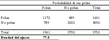 Se hizo un análisis complementario para ver la bondad de ajuste del modelo. Calculando la probabilidad estimada que el hogar sea pobre en función del grupo de variables explicativas. Se observa que el modelo predice el resultado de la variable pobre (pobre, no pobre) en el 78 % de los casos.