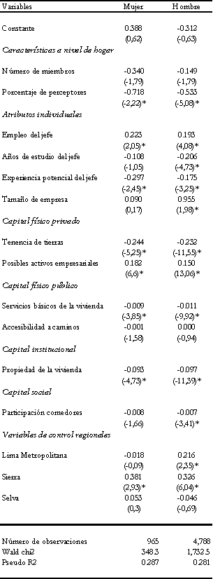 Finalmente, un resultado interesante se refiere al tema de género. En la regresión general, se puede observar que el coeficiente no es significativo para la variable "hombre", lo cual indicaría que no existen diferencias por género. Este resultado es un poco extraño, pero se puede especular que la creciente participación de la mujer en el mercado laboral lo está motivando. Sin embargo, cuando se analizan las regresiones por separado (modelos probit que se muestran en el cuadro 3), se encuentra que las variables familiares tienen efectos marginales mayores para las mujeres. Es decir, los condicionantes familiares tendrían un efecto mayor para las mujeres. Además, el impacto de la participación familiar en la obtención de ingresos reduce mucho menos la probabilidad de que un hogar con jefa mujer sea pobre que en el caso de un hogar con jefe hombre.