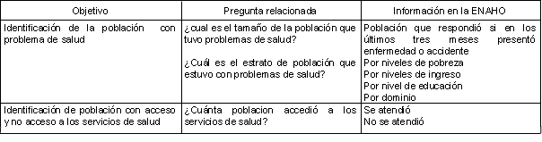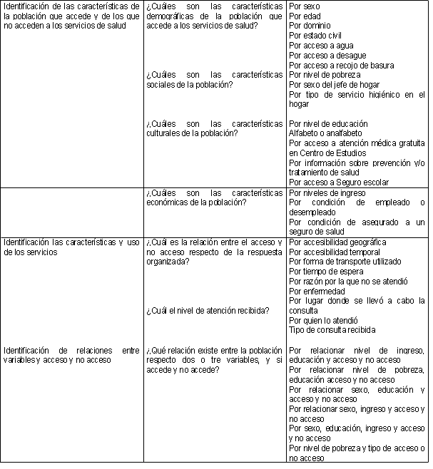 Revisión del cuestionario para selección de preguntas relevantes para el estudio Identificación de la variable acceso a los servicios de salud Identificación de otras variables a partir de la encuesta Generación de variables que se deben relacionar con el acceso y no acceso Procesamiento de la encuesta Estratificación de la población según: deciles y cuartiles de ingreso, y según niveles de pobreza. Relacionar variables de acceso con las otras variables escogidas Diseño de cuadros estadísticos de salida