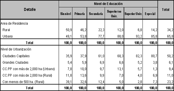 En el Cuadro Nº 6, que reúne a la población por Area de Residencia y estrato geográfico según nivel educativo, encontramos que la población que reporta más enfermedad es la población urbana, siendo mayor el porcentaje conforme sea el nivel de educación, contrariamente ocurre con la población rural, que manifestó enfermedad o accidente en un 50,9% de la población que no tenía nivel de educación, y que conforme aumenta el nivel educativo la proporción disminuye. Evidencia ello lo que manifestamos anteriormente, la población más informada es la que percibe más la enfermedad, y que la población que más riesgo tiene de enfermarse es la población con menor nivel de educación que se encuentra en el área rural.