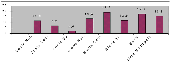 Otra característica importante es la incidencia de enfermedad por área de residencia. La población que manifestó haber tenido enfermedad o accidente en los últimos tres meses, la ENAHO refiere que la población de la Sierra Centro es la que más tuvo problemas de salud, participando con un 19,3 % del total de esta población, seguido por la población de la Selva que participa con un 17,9 % del total y luego Lima Metropolitana que alcanza a ser el 15,8 del total de esta población. Siguen los otros dominios de estudio y resaltan por su menor participación la población de la Costa Centro que participa con un7,2% y la Costa Sur con un 2,4% del total. Ver Cuadro Nº 7.