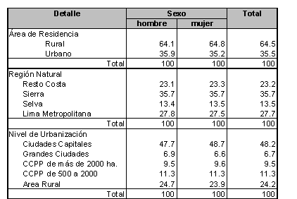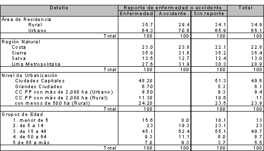 El Cuadro Nº 9 muestra la población que reportó enfermedad o accidente por sexo y según Area de Residencia, Región Natural y Nivel de Urbanización, notándose que en general las proporciones tanto hombres como de mujeres son similares en su participación en el reporte de enfermedad o accidente respecto del total de la población, ello estaría indicando que existe la misma probabilidad de enfermarse o accidentarse indiferentemente del sexo de la persona según donde viva, estas proporciones también indican que la población rural representó el 35,5% del total de la población que reportó enfermedad o accidente, mientras que la población urbana alcanzó a ser el 64,5% del total de esta población que reportó algún problema de salud. También se indica que la población que más reporta enfermedad o accidente vivía en la Sierra (35,7% del total reportada) y que además visto por Nivel de Urbanización el 48,2% de la población que reportó enfermedad o accidente habitaba en las Ciudades Capitales.