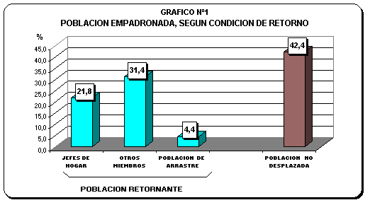 El análisis de la población desplazada retornante muestra que el 21,8% son Jefes de Hogar, el 31,4% Otros Miembros (esposa (o), hijos u otros familiares) y el 4,4% involucra a la denominada Población de Arrastre, es decir, a aquellos miembros que actualmente conforman el hogar, pudiendo haber nacido en el lugar de refugio de los desplazados o, que por otra razón, acompaña al hogar con ánimo de permanecer en el proceso de retorno sin tener la condición de desplazados por violencia.