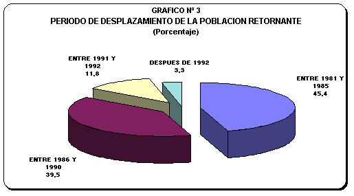 De acuerdo a la información obtenida en la encuesta, el proceso de desplazamiento de la población iniciado en 1981 habría tomado su punto más alto entre los años 1983 y 1984. El 45,4% de la población retornante entrevistada manifestó que abandonaron el centro poblado de origen entre 1981 y 1985.