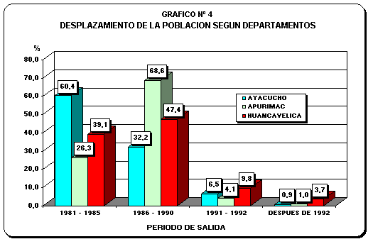 A nivel departamental, en el período 1981–1985, los mayores desplazamientos se habrían dado en los departamentos de Ayacucho (60,4%) y Huancavelica (39,1%). Mientras que en el período de 1986–1990 este proceso se habría intensificado en Apurímac donde el 68,6% de la población retornante abandona sus centros poblados de origen.