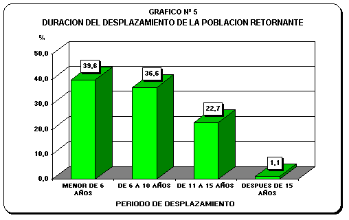 La población desplazada retornante, cuyo período de desplazamiento tuvo una mayor duración (más de 15 años), representa sólo el 1,1% del total de retornantes.