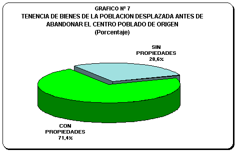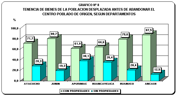 A nivel departamental, la población desplazada retornante de Apurímac, Huancavelica y Ayacucho muestra porcentajes por encima del 25% acerca de la condición de no tenencia de bienes. En términos porcentuales esta condición fue manifestada por el 38,1% de los retornantes de Apurímac, el 35,4% de Huancavelica y el 28,3% de Ayacucho.