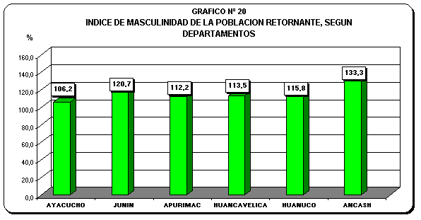 A nivel departamental, los valores más altos de índice de masculinidad se encuentran en Ancash 133 hombres por cada 100 mujeres en Junín, 120 hombres por cada 100 mujeres. El departamento de Ayacucho muestra el menor valor en el indicador, 106 hombres por cada 100 mujeres retornantes.