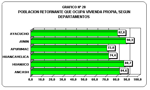 Una menor proporción de tenencia de vivienda propia, fue manifestada por la población retornante de los departamentos de Huánuco (88,4%), Ancash (84,6%), Ayacucho (82,8%), Huancavelica (74,4%) y Apurímac (72,8).