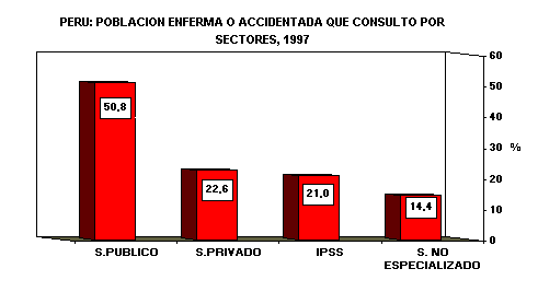 En cambio, a los establecimientos de salud del sector privado y a los establecimientos de salud del Instituto Peruano de Seguridad Social acuden en mayor proporción los enfermos o accidentados del área urbana que de la rural. Así, mientras que a un consultorio particular o clínica acudieron el 24,9% de los afectados del área urbana en el área rural lo hicieron el 17,3%. La mayor brecha de cobertura se observa en los establecimientos del IPSS, mientras que más de la cuarta parte (27,3%) de los enfermos del área urbana consultaron en estos establecimientos, en el área rural sólo lo hicieron el 6,1%.