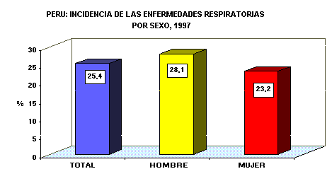 Tanto en el área urbana como la rural, los hombres habrían padecido más que las mujeres de este tipo de enfermedad. Así, mientras que el 29,0% y el 26,5% de los hombres del área urbana y la rural respectivamente manifestaron haber sufrido de una enfermedad del sistema respiratorio, las mujeres del área urbana y rural lo hicieron el 24,3% y el 20,7% respectivamente.