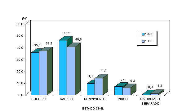 La situación descrita, explicaría el aumento de la importancia relativa de la población que vive en unión consensual o convivencia, que de 9,8% en 1981 sube a 14,5% en 1993. El número de personas divorciadas y separadas también experimenta un ligero incremento con relación al censo de 1981.